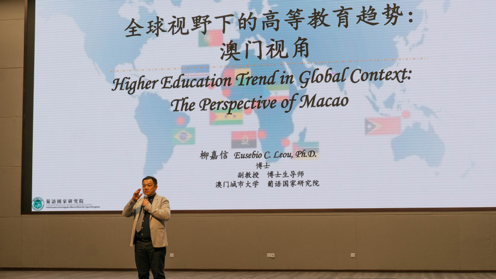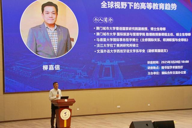 柳嘉信博士用双语作了题为“全球视野下的高等教育趋势:澳门视角”的主旨讲座。讲座围绕民心相通的高教全球趋势、立足粤港澳大湾区、挑战自我与成长以及澳门特色课程案例等内容,通过详实的数据和生动的案例,展示了澳门高校在推动跨文化交流、促进区域教育合作方面取得的显著成效。他鼓励同学们利用外语专业优势,打开学科边界,增强自身的综合素质和竞争力,为国家的发展作出青年人应有的贡献。
