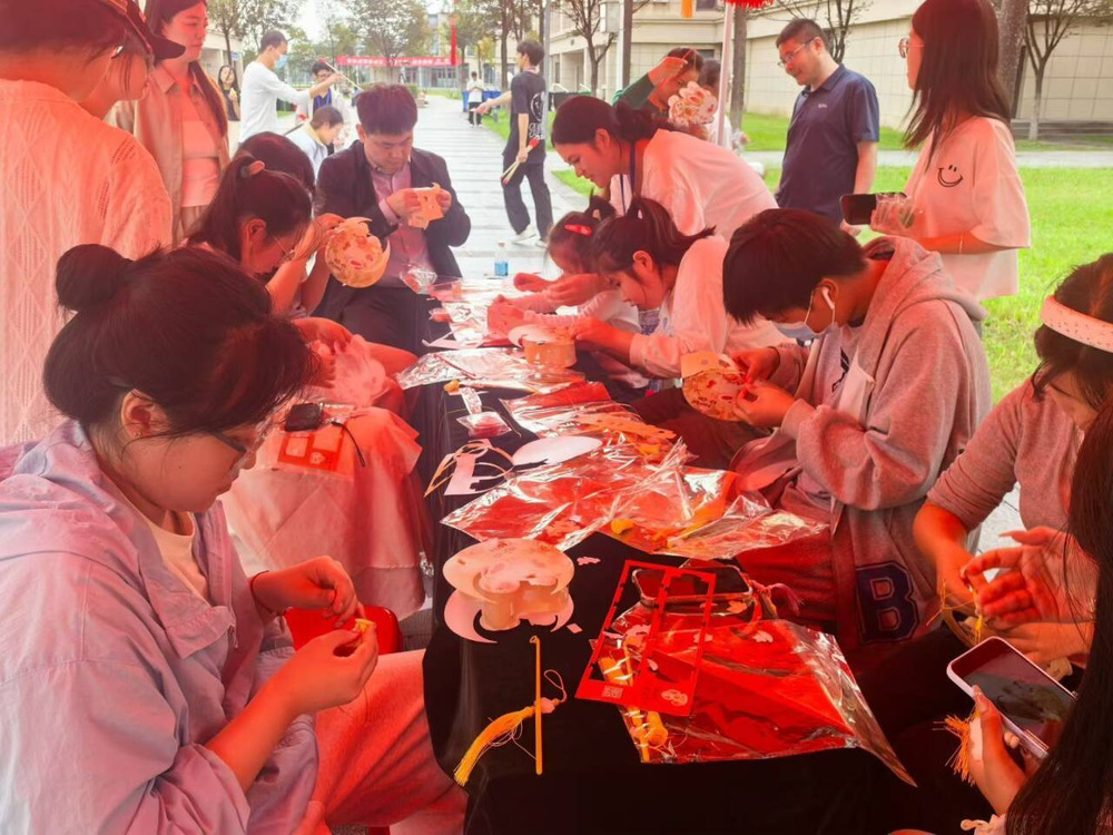 游园会现场布置雅致温馨,设有套圈、投壶、猜灯谜、做花灯、手工制作月饼等活动,吸引了众多同学的积极参与。趣味投壶与套圈游戏每每出现神射手都引发同学们阵阵欢呼;猜灯谜区域人头攒动,同学们或凝神思考,或热烈交流,为猜出正确答案而雀跃;手工灯笼、手工月饼制作区内,同学们在老师、宿管阿姨及物业工作人员的指导下,拆折、编织、拼装、点亮,揉面、裹馅、压模、装盒,每一个步骤都承载着对团圆的美好祈愿。现场欢声笑语不断,节日氛围浓厚。